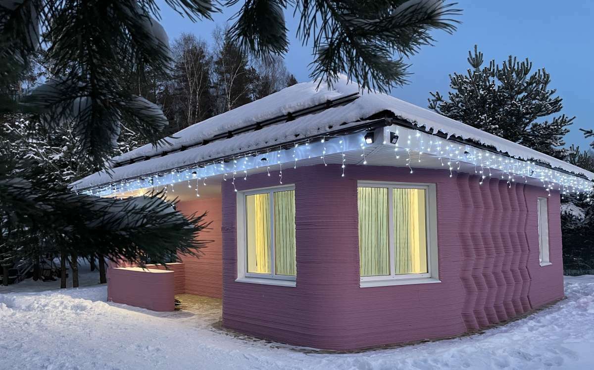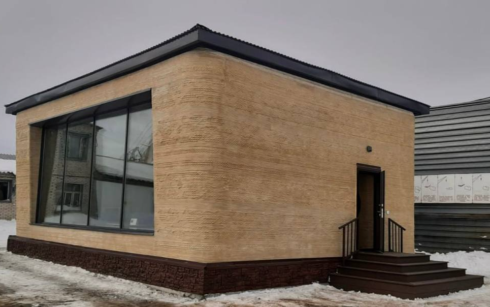 The building was printed in winter, within a heated enclosure where the ambient air temperature reached -40 degrees Celsius, while inside the enclosure, the temperature remained no lower than 10 degrees Celsius. The structure is industrial rather than residential. The building's facade features reliefs and patterns. The walls were not plastered after printing but treated with hydrophobic compounds and coated with lacquer, preserving the texture of the print.