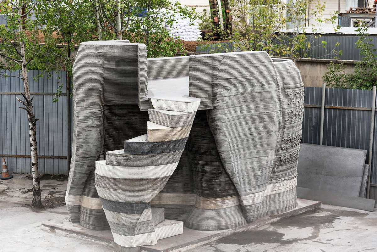 Elephant House - Moscow Region. This geometrically complex field 3D printing in concrete is unparalleled in Russia. The unique self-supporting spiral staircase was designed by artificial intelligence.