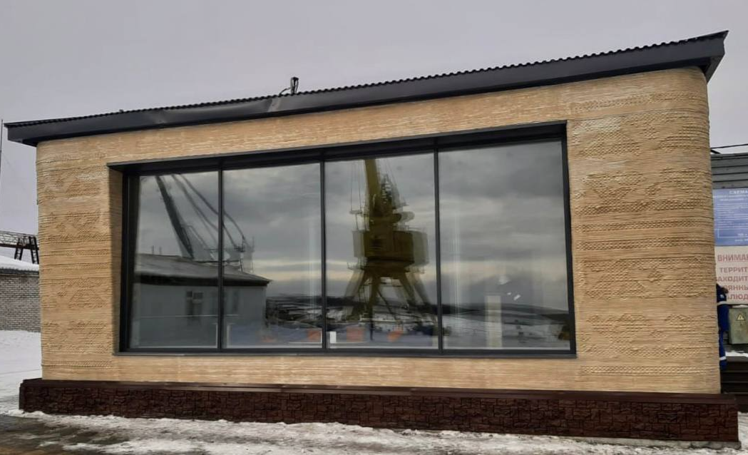 At the edge of the Arctic Circle, a production building was printed using the "AMT" S300 printer. The building covers an area of 80 square meters, with a single floor, a large hall, and a reception desk.
